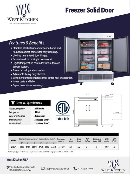 West Kitchen W56F 55"W Reach-In Freezer with 2 Solid Doors