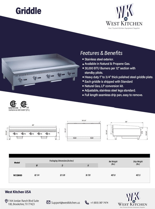 West Kitchen WCGM60 60"W NG/LP Gas Manual Countertop Griddle