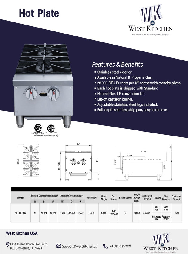 West Kitchen WCHPA12 12"W NG/LP Gas Hot Plate with 2 Burners