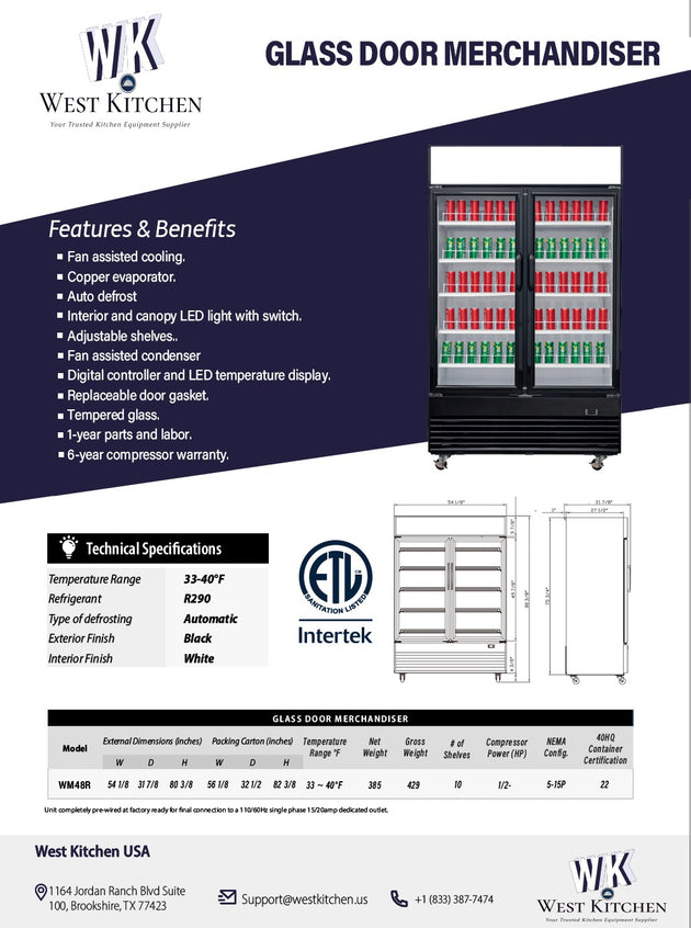 West Kitchen WM41R 47"W 2 Door Swing Glass Merchandiser Refrigerator
