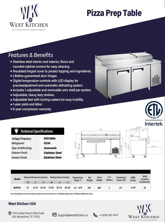 West Kitchen WPP70 70"W Refrigerated 2 Door Pizza Prep Table 9 1/3 Pan Capacity