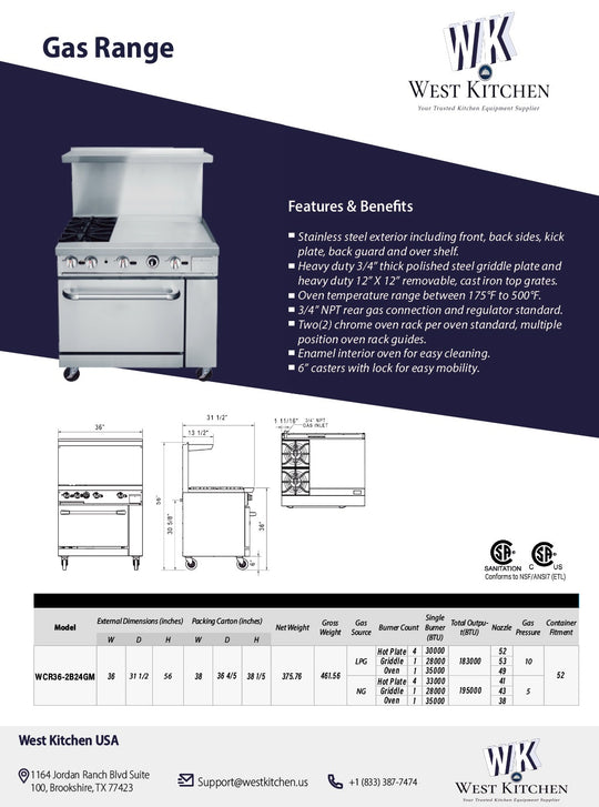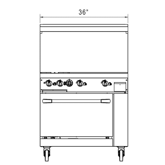 West Kitchen WCR36-4B12GM 36"W NG/LP Gas Oven Range with 4 Burners and 12" Manual Griddle