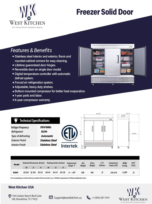 West Kitchen W84F 83"W Reach-In Freezer with 3 Solid Doors