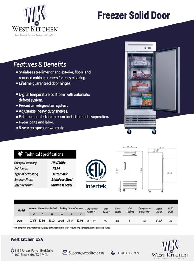 West Kitchen W29F 27"W Reach-In Freezer with 1 Solid Door