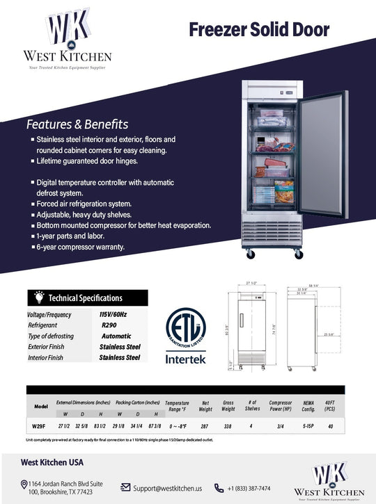 West Kitchen W29EF 27"W Reach-In Freezer with 1 Solid Door