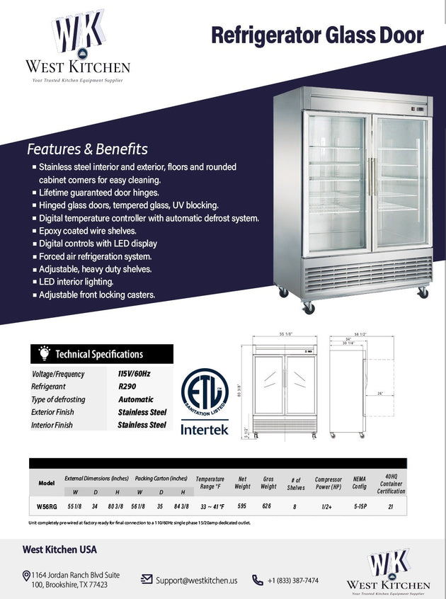 West Kitchen W56RG 55"W 2 Door Glass Reach-In Refrigerator