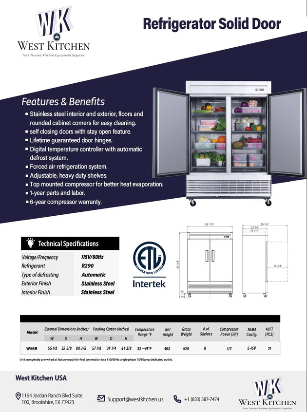 West Kitchen W56R 55"W Reach-In Refrigerator with 2 Solid Doors