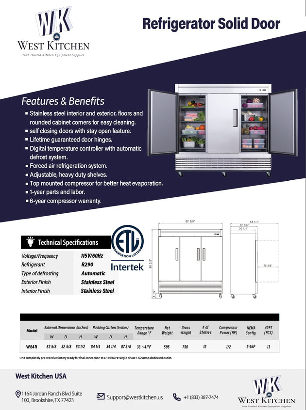 West Kitchen W84R 83"W Reach-In Refrigerator with 3 Solid Doors