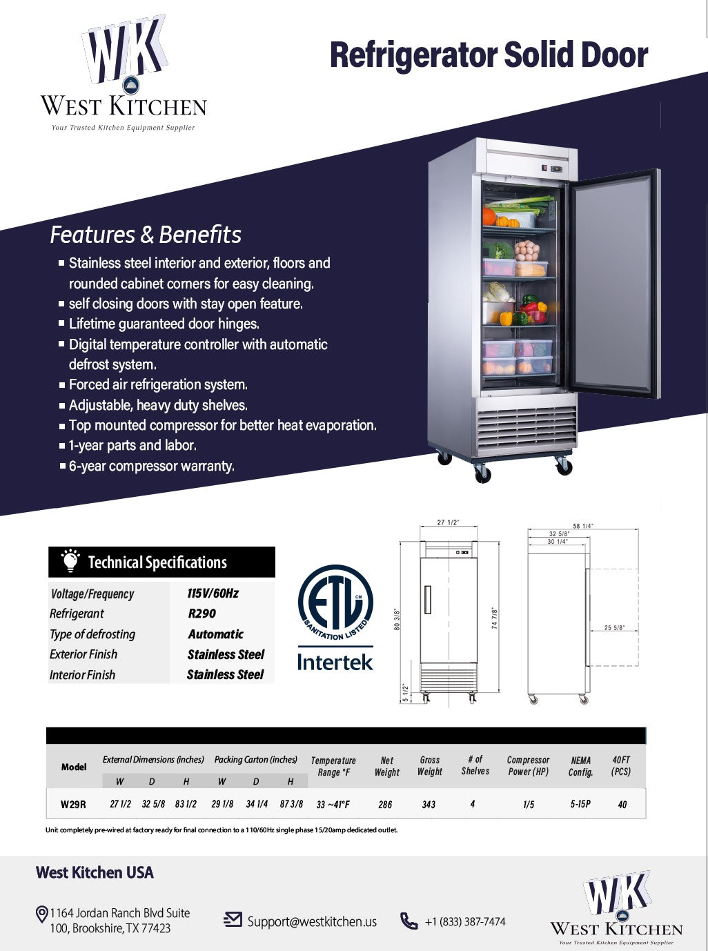 Compliance and Safety: Certified to NSF/ANSI 7 Standard for Commercial Refrigerators, ETL Listed, and ETL Sanitation for quality assurance.