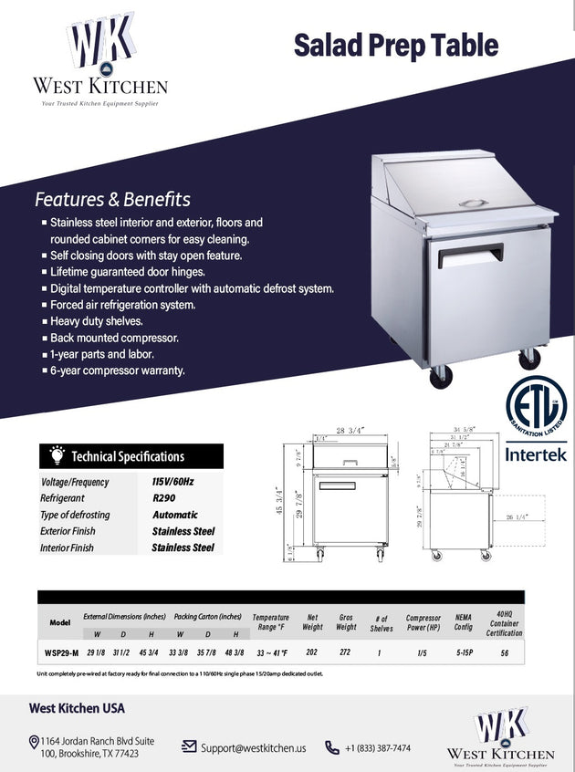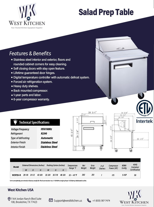 West Kitchen WSP29 29"W Refrigerated Sandwich Prep Table with 1 Door and 8 1/6 Pans