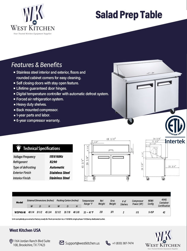 West Kitchen WSP48 48"W Refrigerated Sandwich Prep Table with 2 Doors and 12 1/6 Pans