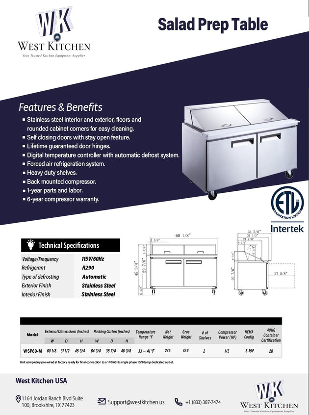West Kitchen WSP60M 60"W Megatop Refrigerated Sandwich Prep Table with 2 Doors and 24 1/6 Pans