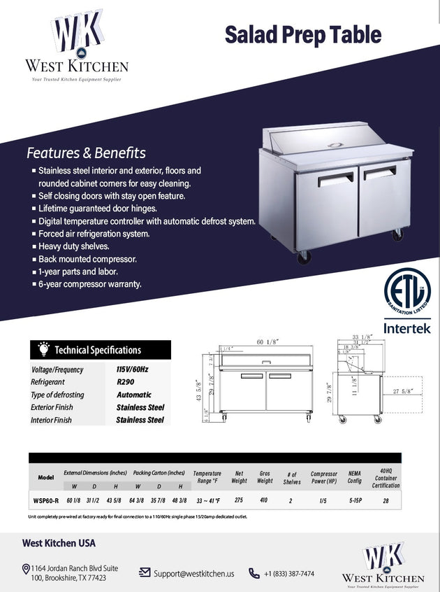 West Kitchen WSP60 60"W Refrigerated Sandwich Prep Table with 2 Doors and 16 1/6 Pans