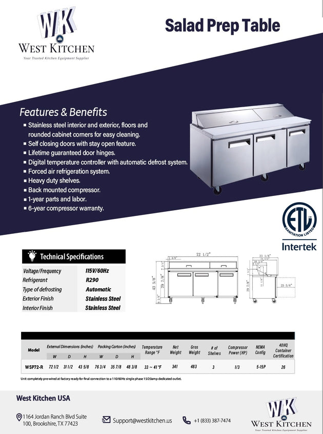 West Kitchen WSP72 72"W Refrigerated Sandwich Prep Table with 3 Doors and 18 1/6 Pans