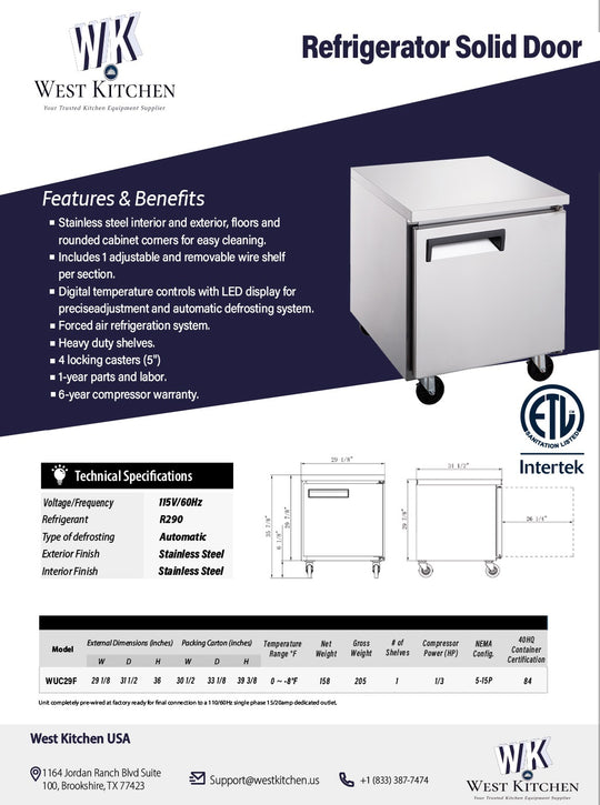 Upgrade your kitchen's refrigeration capabilities with the West Kitchen WUC29R 30"W Undercounter 1 Door Worktop Refrigerator. This versatile undercounter refrigerator is crafted for durability, efficiency, and easy accessibility. With its robust features and compact design, it's...Sale price $818.00Regular price $1,378.80Sale price $818.00Regular price $1,378.80 -
