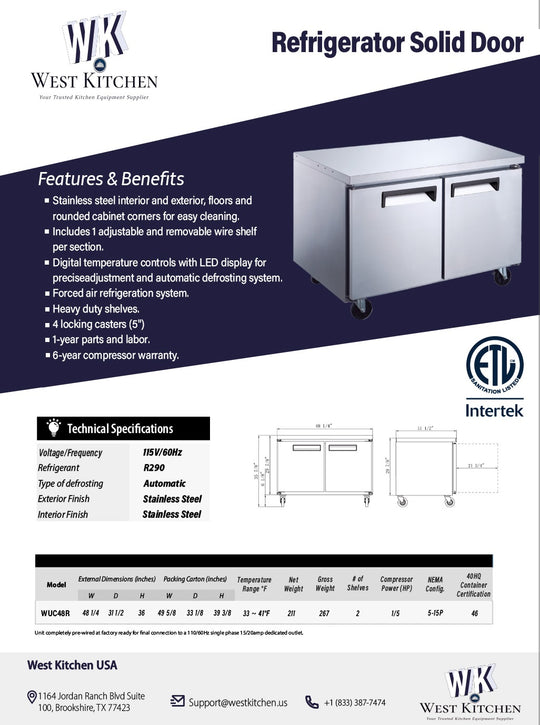 Elevate your kitchen's refrigeration capabilities with the West Kitchen WUC48R 48"W Undercounter 2 Door Worktop Refrigerator. This refrigerator is meticulously crafted to provide efficient cooling while offering a durable and space-efficient solution for your commercial kitchen...Sale price $1,490.00Regular price $1,740.00Sale price $1,490.00Regular price $1,740.00 -